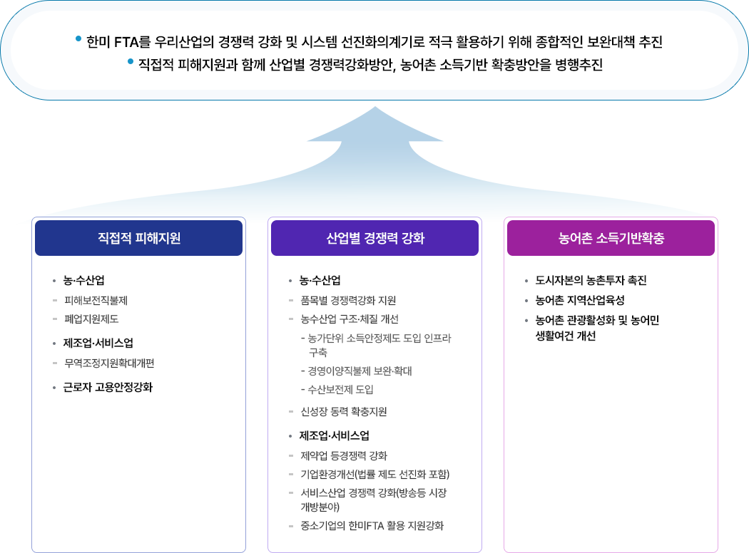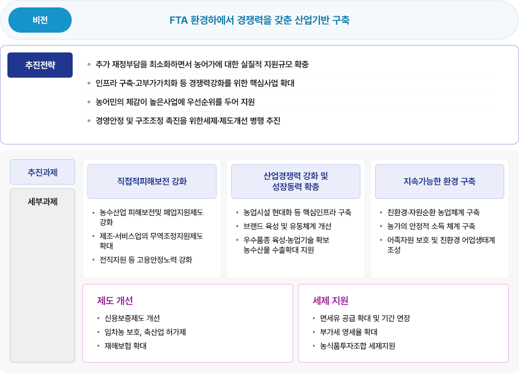 - 직접적 피해지원과 함께 산업별 경쟁력강화방안, 농어촌 소득기반 확충방안을 병행추진