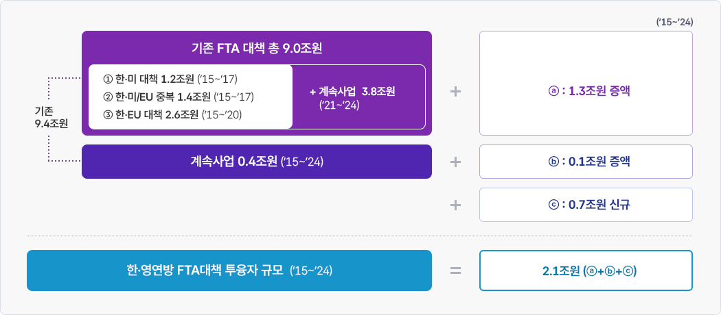 한·영연방 FTA 국내보완대책은 향후 10년간(‘15~’24) 총 2.1조원을 추가 지원하는 투융자계획을 수립하여, 향후 10년간 추가 지원규모를 15년간 총 피해액 수준과 균형되도록 마련하였습니다.